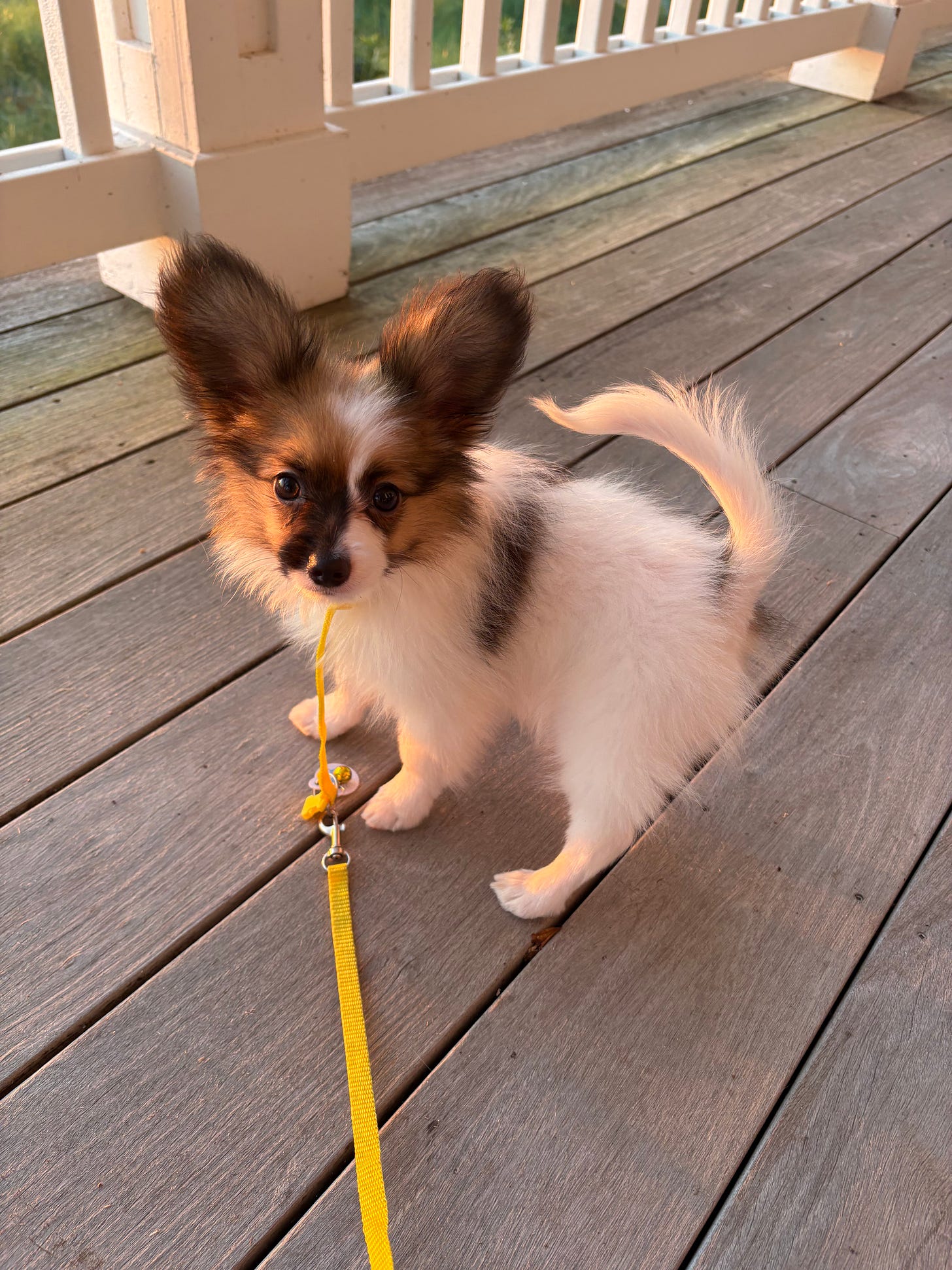 Percy on my porch. What do you think he’s planning next? It’s a wonder what a 4 lb. Papillon baby will do at twelve weeks.